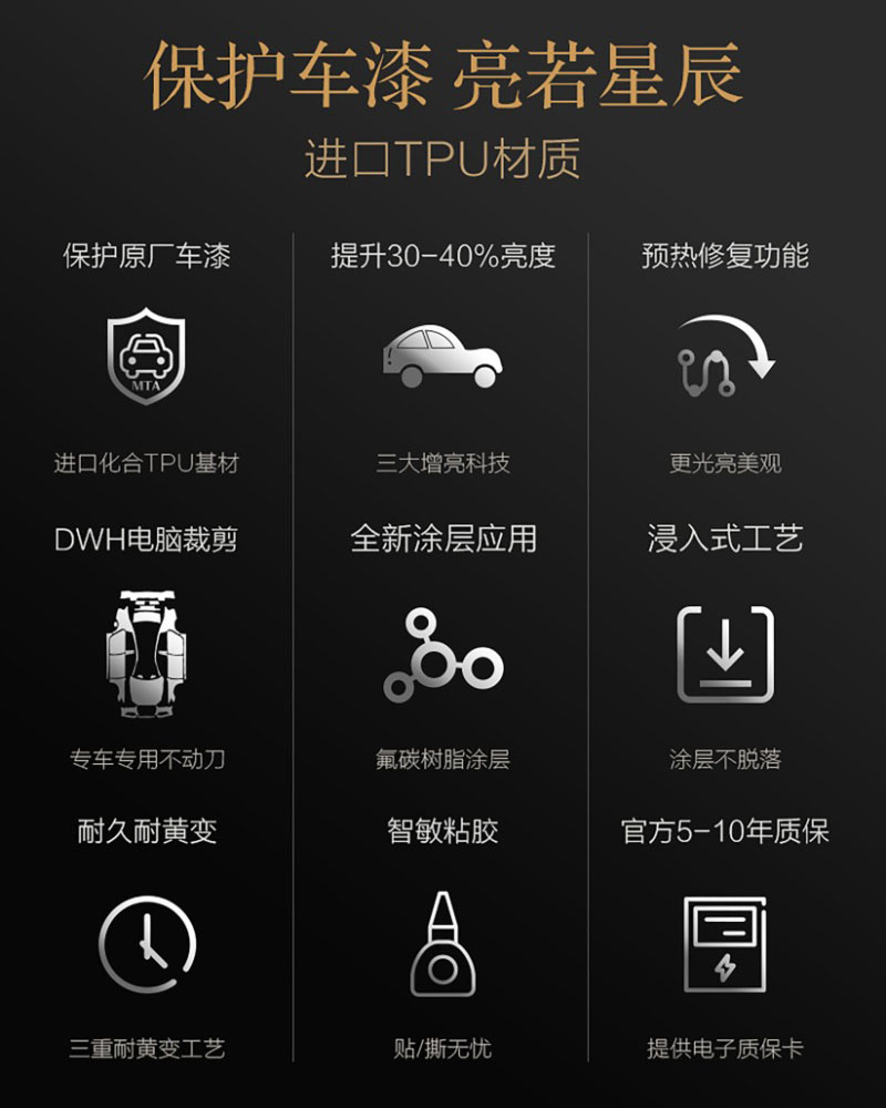 英特威漆面保护膜经过不断创新,综合了目前漆面保护膜的特性,经过无数次的破坏性实验推出漆面保护膜新品系列,产品不仅具有优秀的抗污能力,而且常温自动修复,达到目前行业较高水平。英特威漆面保护膜继续坚持创新、全力以赴保证一如既往的卓越品质,为客户提供一流的产品和服务!